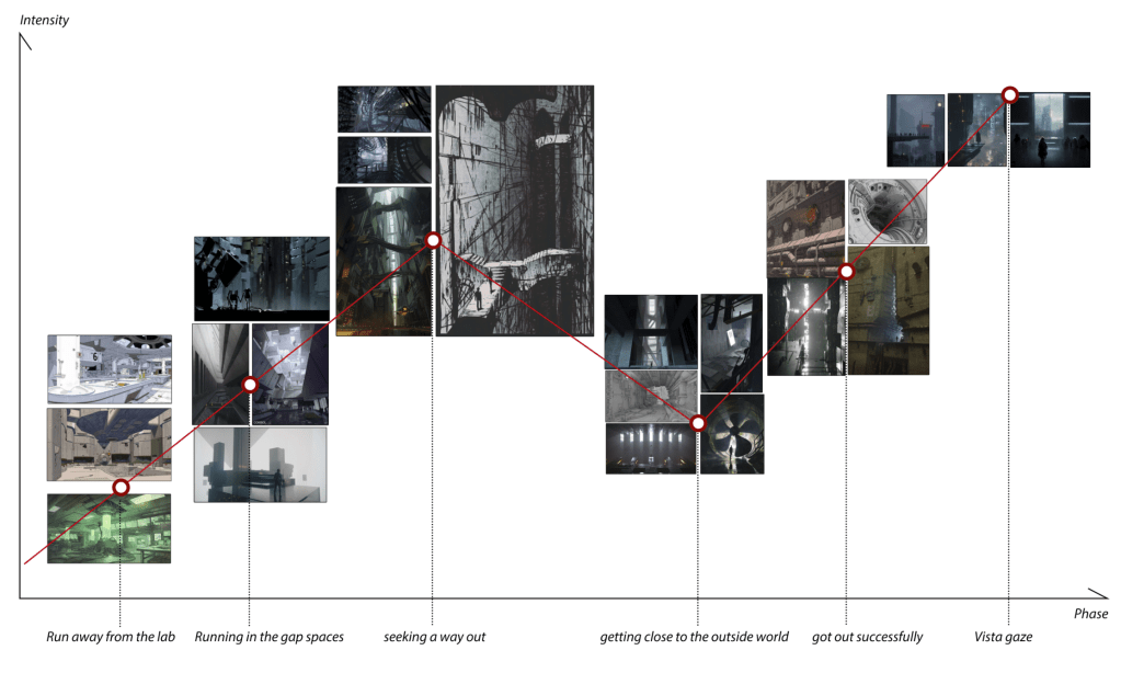 Search and organization of visual references and relevant assets for Unreal Engine 5, Pitch for objectives, Iteration of layout design and modeling, Visual scripting, Playtests, Design documentation.