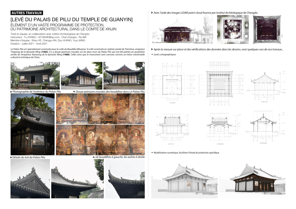 Surveying and mapping project by a team of five members: MA Rui, HE Shiyu, AN Chengyu, JIANG Yuqi, HUANG Ziyu, directed by ZHANG Yu, in collaboration with Institute of Archaeology of Chengdu, Jul 2021. My role in the teamwork included coordination, surveying and mapping of certain structural and decorative parts of the Pilu Palace, which was built around 600 years ago.